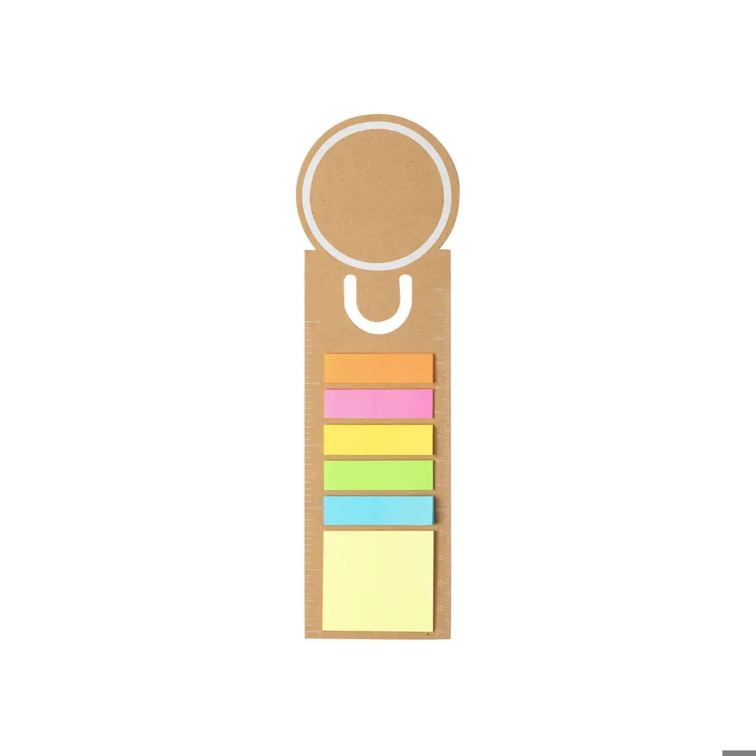Marque pages/règle. Fabriquée en carton recyclé, avec une large surface d´impression. Comprend 15 notes adhésives de taille moyenne et 75 mini notes adhésives
