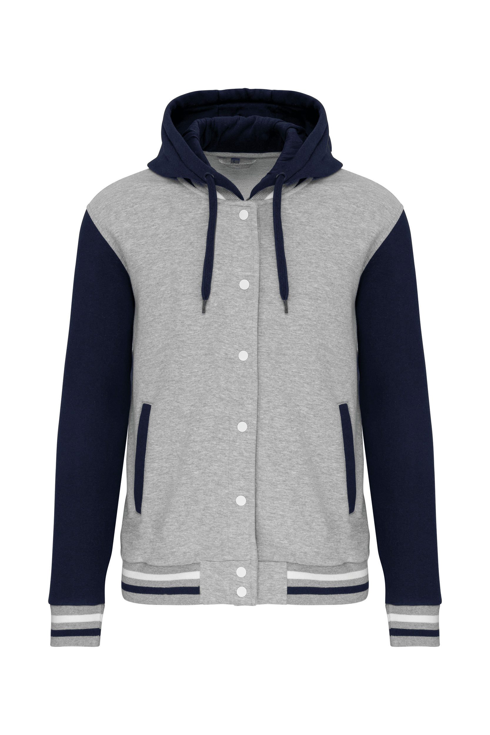 70% coton / 30% polyester. Molleton gratté 3 fils. Manches montées contrastées. Capuche en 3 parties, doublure jersey et cordons contrastés. Fermeture devant par boutons pression. Bord côte avec 2 liserés contrastés au col, manches et bas de vêtement. 2 poches passepoilées devant. Bande de propreté en chevron et boucle d'accrochage à l'intérieur col. Pas d'étiquette de marque au col, uniquement une puce de taille pour faciliter la personnalisation. Véritable icône, le Teddy a traversé les époques. Il se décline partout, de la rue aux bancs des écoles et même sur les podiums. Certifié STANDARD 100 by OEKO-TEX®N° CQ1007/7, IFTH. L'indémodable Teddy inspiré des universités américaines. Confort optimal. Urbain et polyvalent.