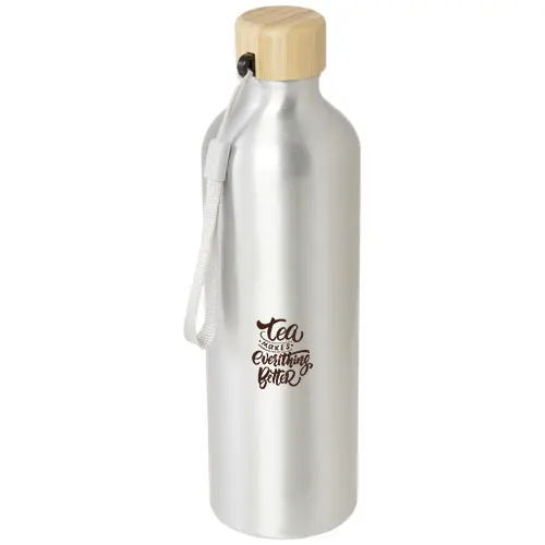 Bouteille d'eau en aluminium recyclé certifié RCS avec un élégant couvercle en bambou. Cette bouteille légère à simple paroi est munie d'une sangle pour faciliter son transport. Le bambou provient de sources durables, respectueuses de l'environnement et socialement responsables. Capacité de 770 ml. Lavage à la main uniquement.