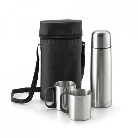 Ensemble de bouteille thermique et tasses en acier inoxydable. L'ensemble comprend 2 tasses avec capacité jusqu'à 200 ml, une bouteille à double paroi avec capacité jusqu'à 500 ml, et un sac 600D avec poignée réglable.Trousse: 155 x 250 x 90 mm