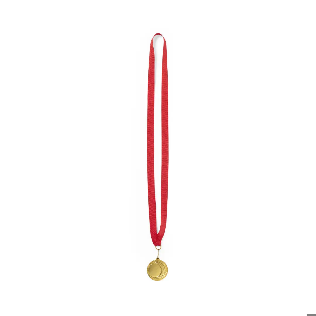 Médaille en métal avec finition or en relief. Avec ruban de polyester en rouge, mousqueton métallique assorti et spécialement conçu pour le marquage laser.
