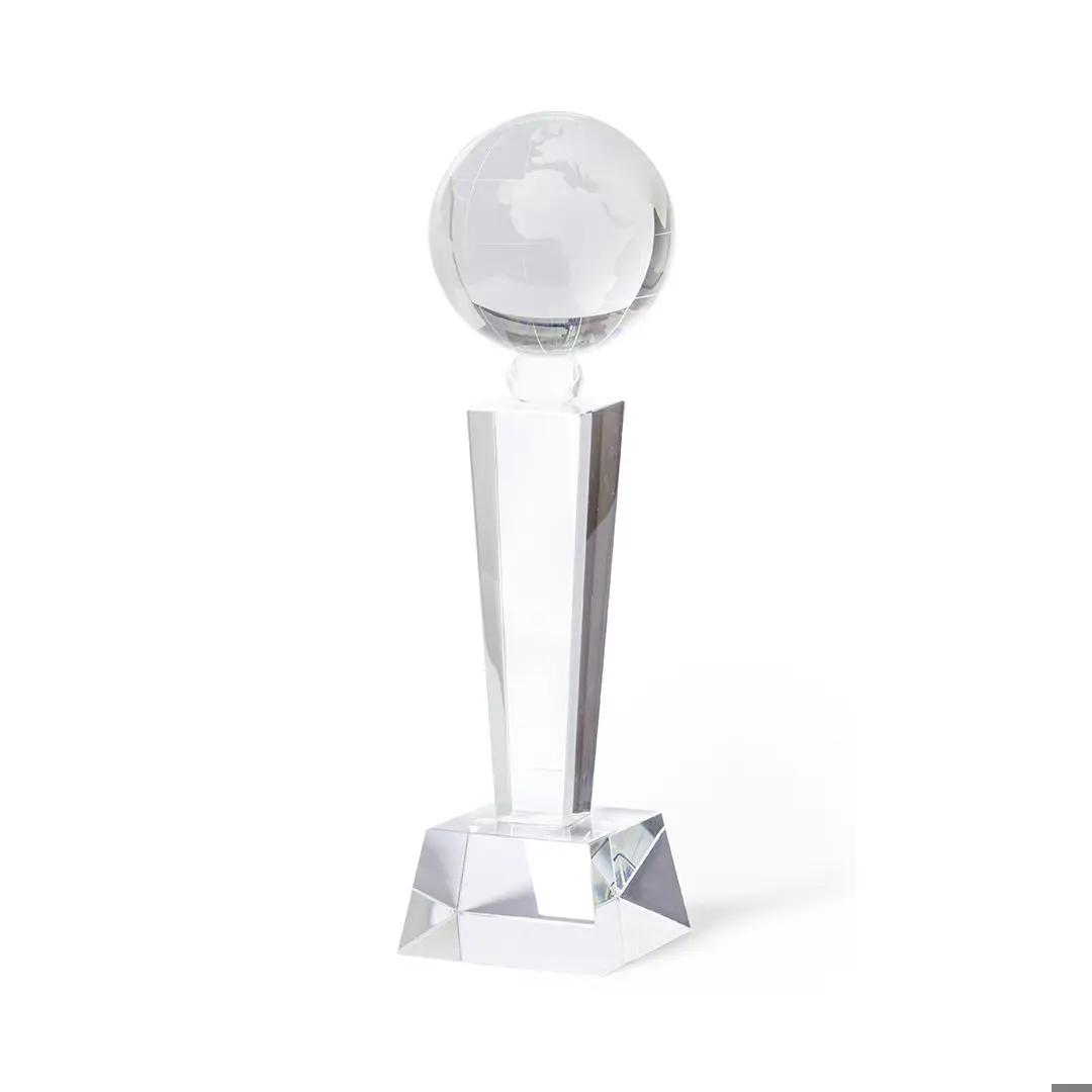 Trophée en verre épais avec un design mondial et une base résistante. Spécialement conçu pour le marquage laser et présenté dans un étui de protection en carton résistant et fermeture magnétique, avec intérieur en mousse découpée.