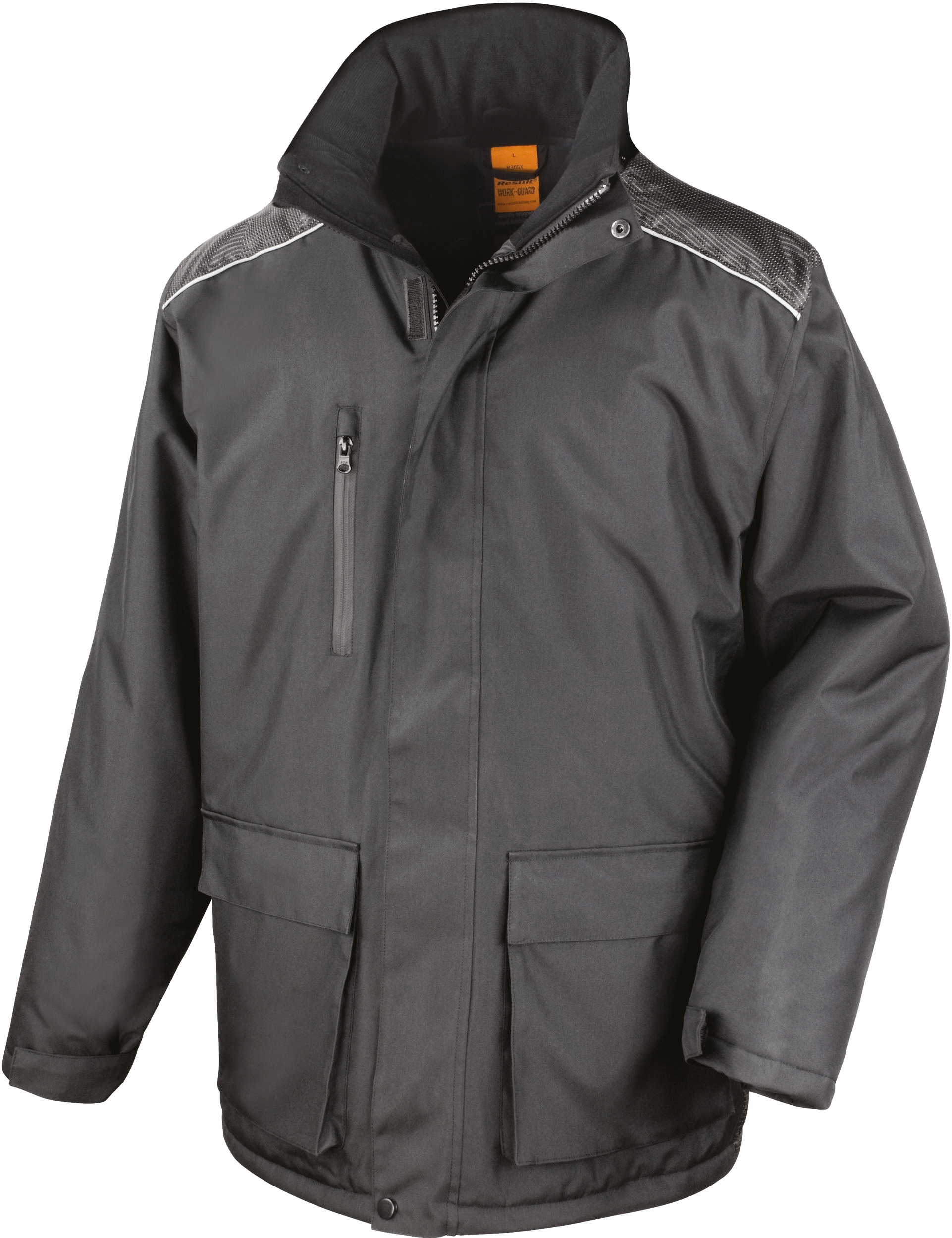 Extérieur : 300D 100% polyester oxford enduit PVC. Doublure : 210T 100% polyester taffeta. Isolation : rembourrage 100% polyester. Imperméable à 2000mm. Coupe-vent. Doublure damassée en losanges. Fermeture zippée 2 directions à l'avant avec rabat de protection fermé par Velcro® et boutons pression. Col doublé en tricot. Capuche ajustable et amovible par zip. Empiècements contrastés en tissu Dobby. Passepoil réfléchissant. Multi poches : poches avant plaquées à fermeture Velcro®, poches latérales chauffe-mains, poche poitrine intérieure. Ourlet réglable par cordon de serrage. Poignets côtelés avec réglage par fermeture Velcro®. Tirettes amovibles sur toutes les fermetures zippées (4 coloris de tirette fournis). Coupe large offrant une bonne mobilité. Résistance aux intempéries, protection optimale. Veste isolante avec maintien thermique.