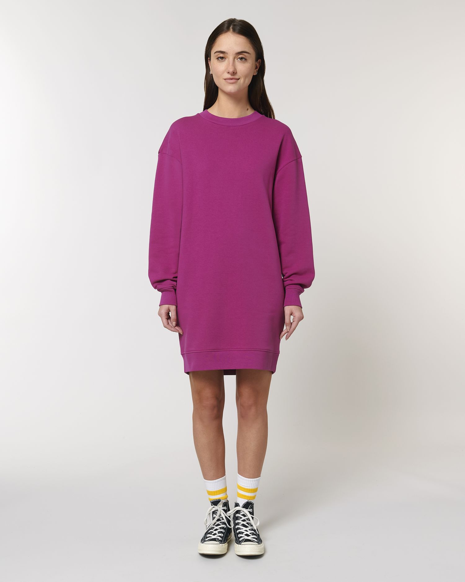 La robe oversize à col rond pour femme. Coupe Oversized, Col rond, Manches longues, Molleton non brossé. Manches montées Bord en côtes 1x1 sur col, bas de manches et bas de corps Bande de propreté intérieur col en chevron Demi-lune à l'intérieur du col dans la matière principale Surpiqûre simple au bas de manches et bas de corps