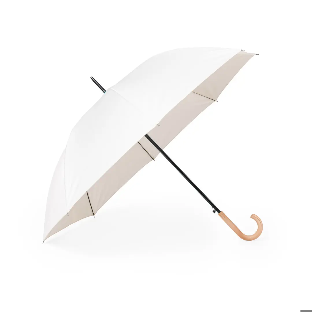 Parapluie à 8 panneaux et 120 cm de diamètre, en matériau pongé 190T résistant avec une finition naturelle. Ouverture automatique et mécanisme anti-vent. Avec tiges en fibre noire, manche en bois et sangle avec fermeture velcro.