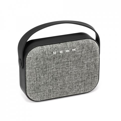 Enceinte avec micro en ABS, en tissu en polyester et finition caoutchoutée. Transmission bluetooth, connexion stéréo de 3.5 mm et lecteur de cartes TF. Contient 2 x 3W/4Ω et autonomie jusqu'à 4 h. Fonctions prise d'appels, contrôle du volume et connexion à playlist du dispositif mobile. Inclut câble USB pour charger. Livré dans coffret cadeau.160 x 120 x 50 mm | Coffret: 180 x 180 x 66 mm