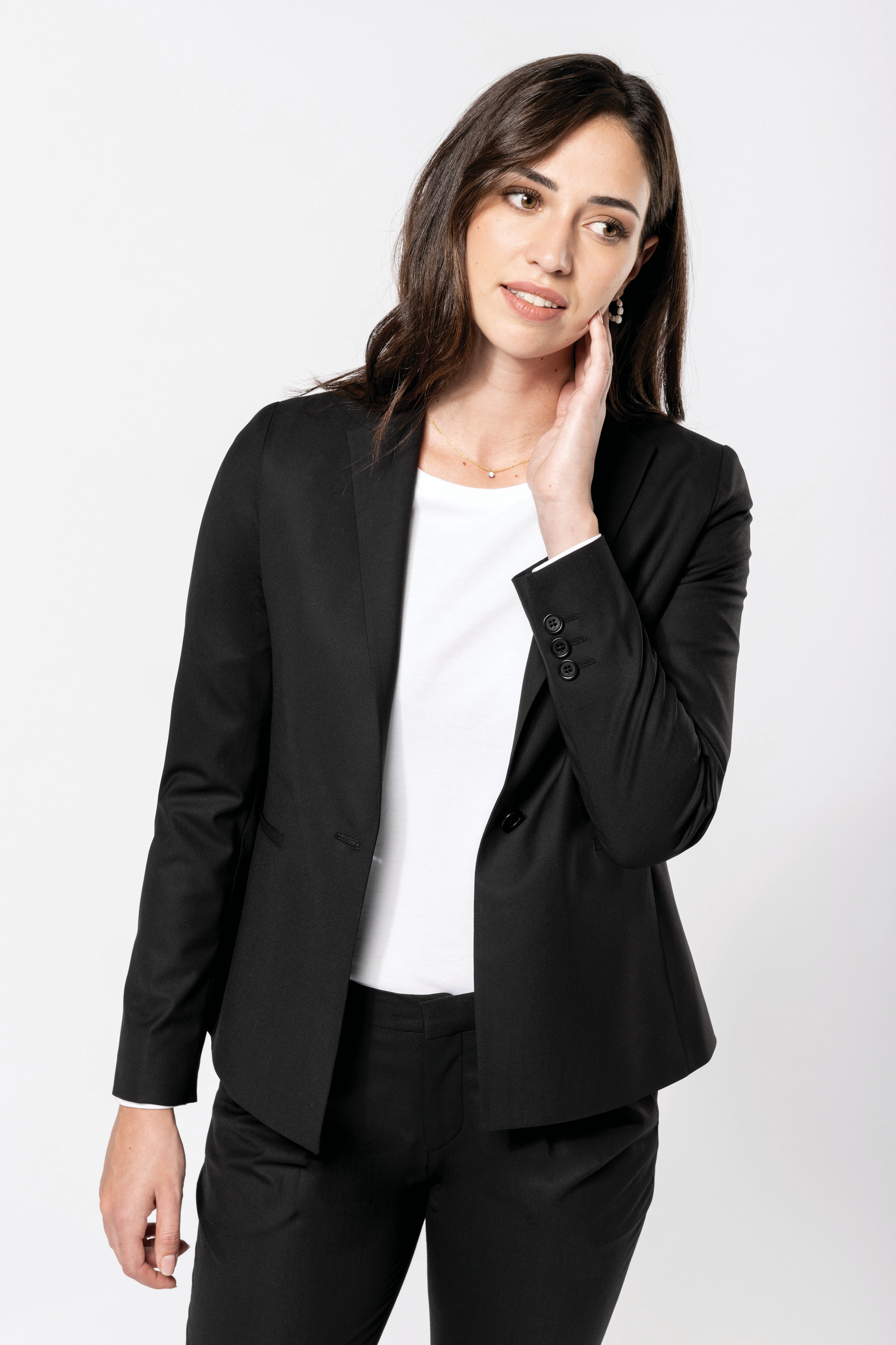 50% polyester / 23% viscose / 22% laine / 5% Elasthanne. Doublure 100% twill polyester ton sur ton avec plis d'aisance. Veste fermée par 1 bouton. 2 poches passepoilées devant. Une poche passepoilée intérieure côté cœur. Bas de manche avec 3 boutons. 1 fente d'aisance au bas du dos. Pas d'étiquette de marque, uniquement une puce de taille pour faciliter la personnalisation. Coupe ajustée très agréable à porter. Matières de qualité apportant confort et chaleur. Ensemble tailleur à compléter avec le pantalon PK750 ou la jupe PK5001.