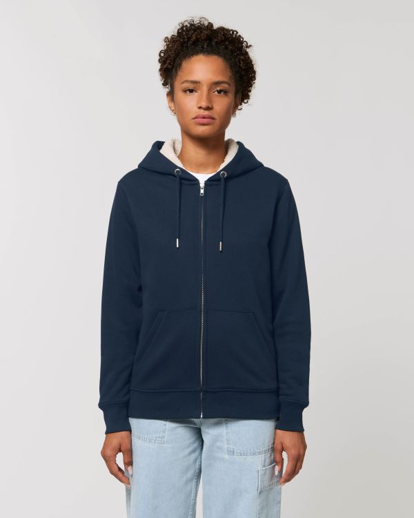Le sweat-shirt zippé capuche unisexe doublé en sherpa. Coupe normale, Col rond à capuche, Manches longues, Molleton non brossé. Manches montées Capuche doublée en sherpa recyclé Cordon rond, ton sur ton, avec embout de finition métal Oeillets métal Bande de propreté intérieur col en chevron couleur naturel 1/2 lune intérieur col dans la matière principale Zip milieu devant recouvert Côte 1x1 au bas de manches et bas de corps Surpiqûre flatlock sur toutes les coutures Poche kangourou Entièrement doublé en sherpa recyclé Poche de poitrine intérieure Zip intérieur invisible en bas de corps pour une personnalisation facile