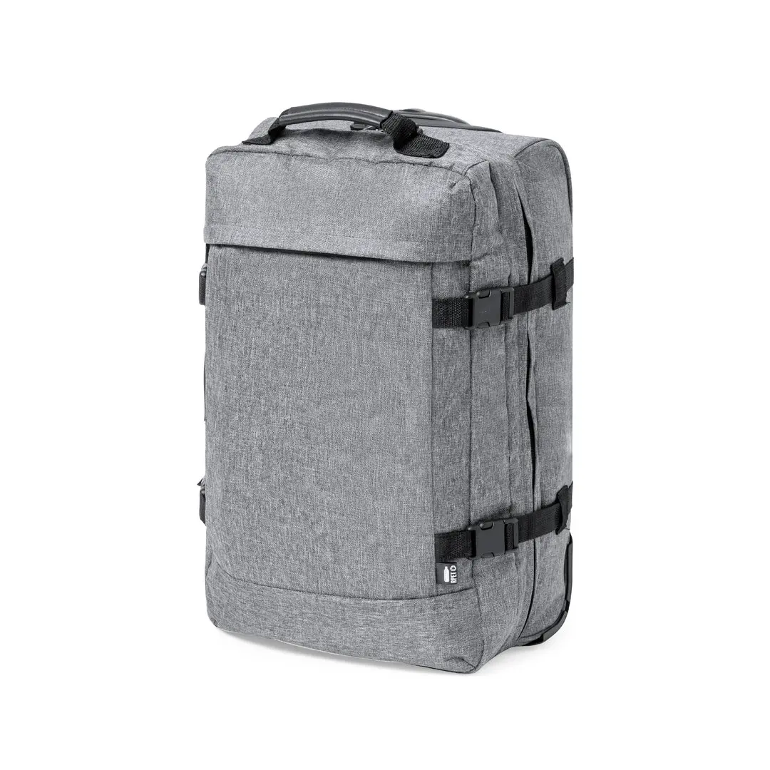 Chariot de la ligne Nature en RPET 300D résistant. Compartiment principal avec fermeture à glissière à double tirette conformément aux normes TSA -Transportation Security Administration-, qui permet aux autorités douanières dinspecter le contenu des bagages sans avoir à forcer ou casser la fermeture, à laide dune clé spéciale à disposition de lautorité.Intérieur doublé avec sangles de fixation élastiques. Extérieur avec 2 sangles réglables, fermetures à boucles, poche frontale avec fermeture éclair invisible et 2 poignées de transport rembourrées. Mécanisme extensible en métal noir, avec une poignée de transport confortable et 2 roues. RPET distinctif sur létiquette extérieure.