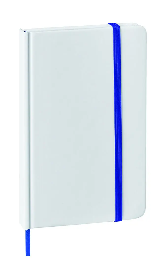 Carnet avec couverture élégant blanche au toucher lisse et en carton résistant. Spécialement conçu pour le marquage digital sur la couverture. 80 feuilles unies avec fermeture par élastique et signet assorti.